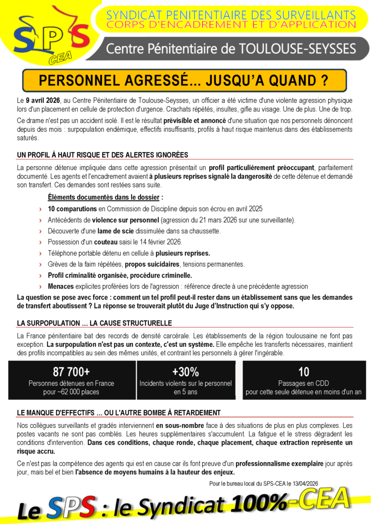 CP de Toulouse/Seysses : personnel agressé… Jusqu’à quand ?