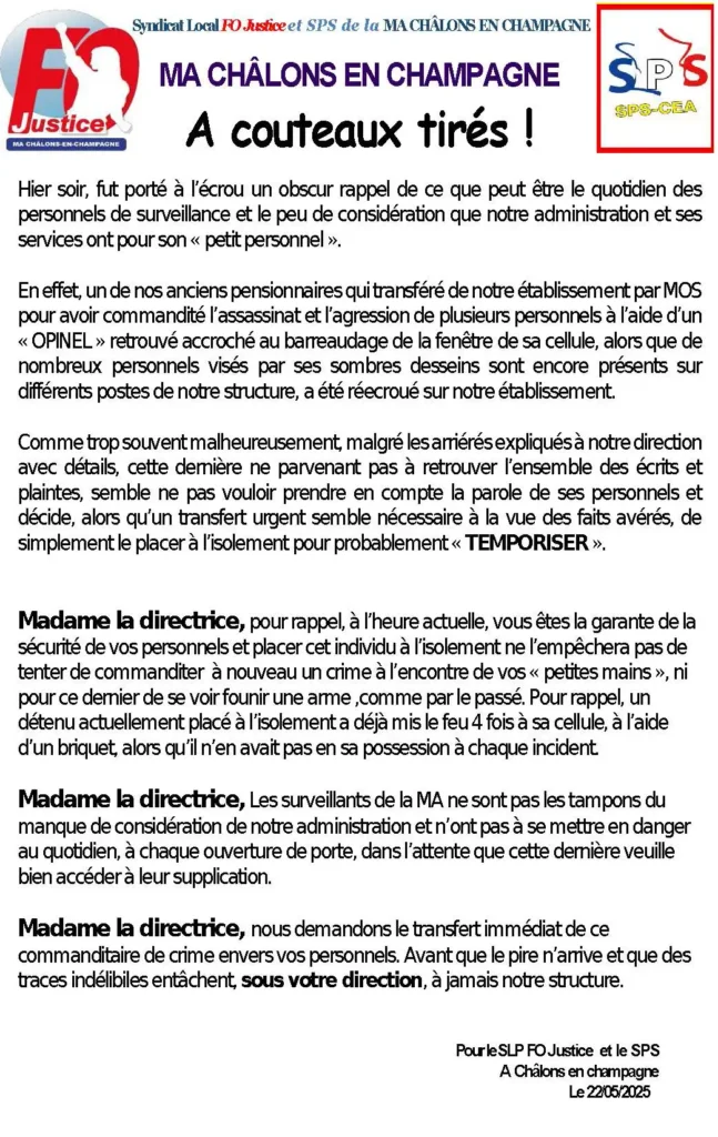 CP Villepinte, ALERTE, ÉTABLISSEMENT EN DANGER